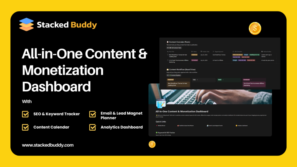 The All-in-One Content & Monetization Dashboard is a Notion template built to solve the biggest pain points bloggers face random content planning, poor SEO organization, and scattered monetization efforts. It combines content planning, SEO tracking, link management, email planning, and analytics into one streamlined dashboard. Bloggers can collaborate with partners, share keyword research, and plan content together, making it easy to stay consistent and grow.